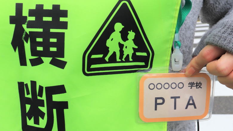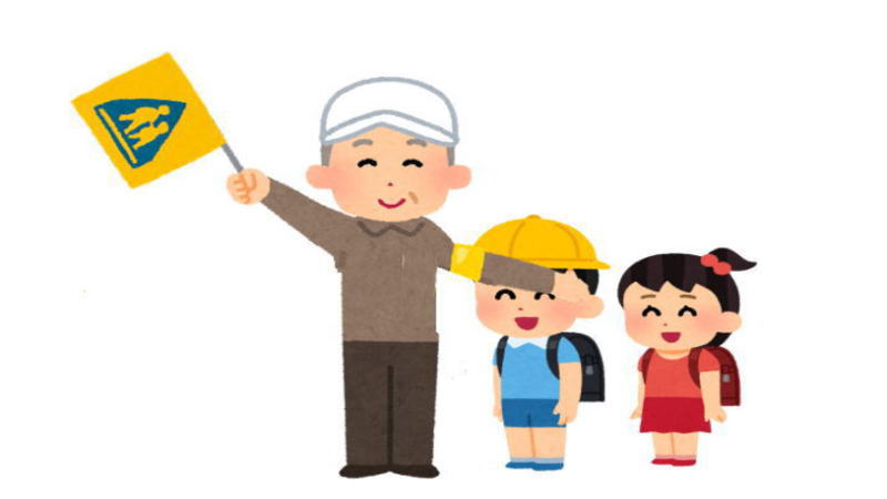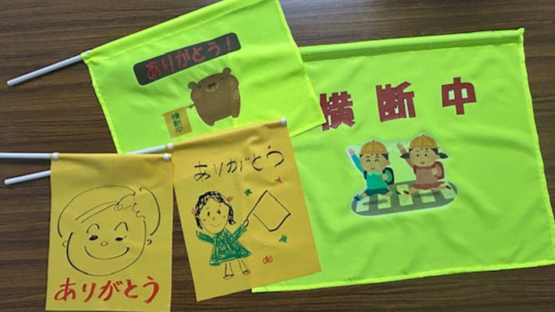 交通指導員の方が横断歩道の入り口で歩行者が青になると旗を出して安全確保をします。または横断する本人が持って横断歩道を渡ります。