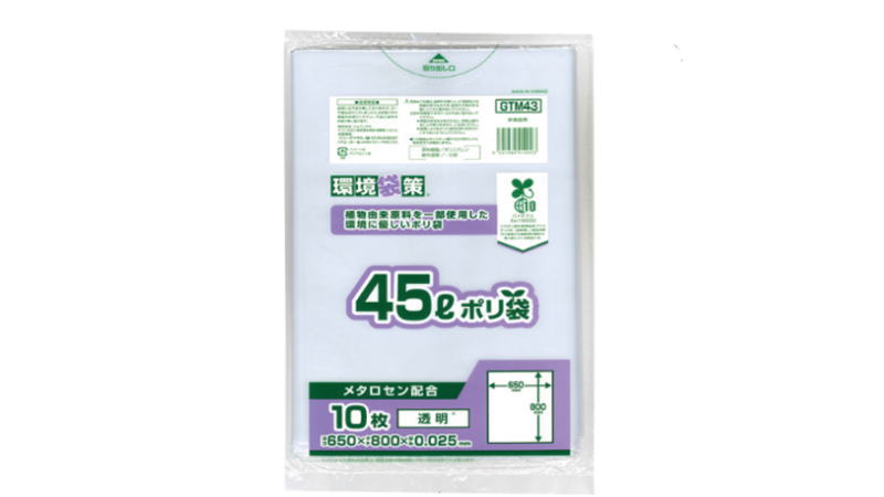 環境に配慮したバイオマス10%配合の45Lポリ袋です。