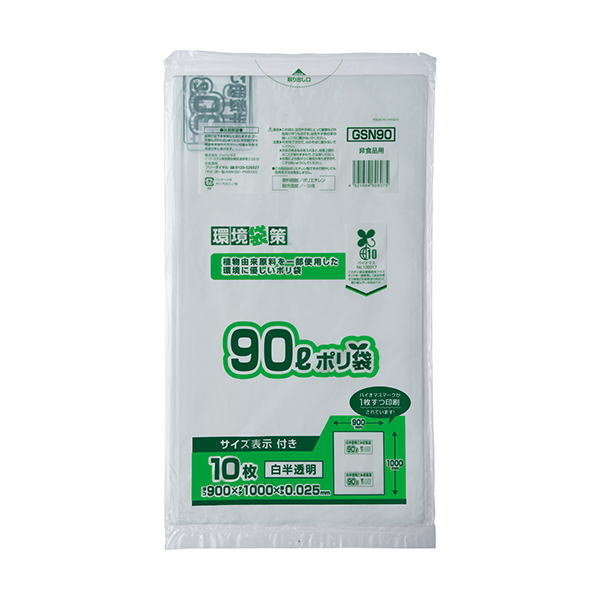 バイオマスマーク取得、90Lポリ袋(ゴミ袋)です。引張り強度に優れた高密度ポリエチレン素材と、サトウキビを主原料とする植物由来の樹脂を使用しています。原料の一部が光合成によりCo2を吸収したサトウキビからできているので、焼却しても地球にやさしい環境配慮型製品です。非食品用。