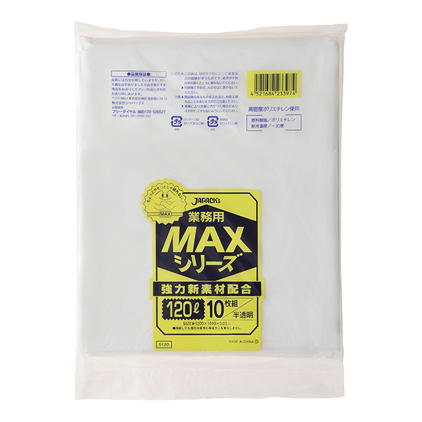 ポリ袋 120Lごみ袋 S120 S120 120Lペール用ポリシャカシャカタイプのポリ袋です。大きなサイズなのでカバーにも使用します。メーカージャパックスサイズ1000X1200mm厚さ0.03mm素材HDPE色半透明1袋入数10枚箱入数200枚JANコード452168... ポリ袋