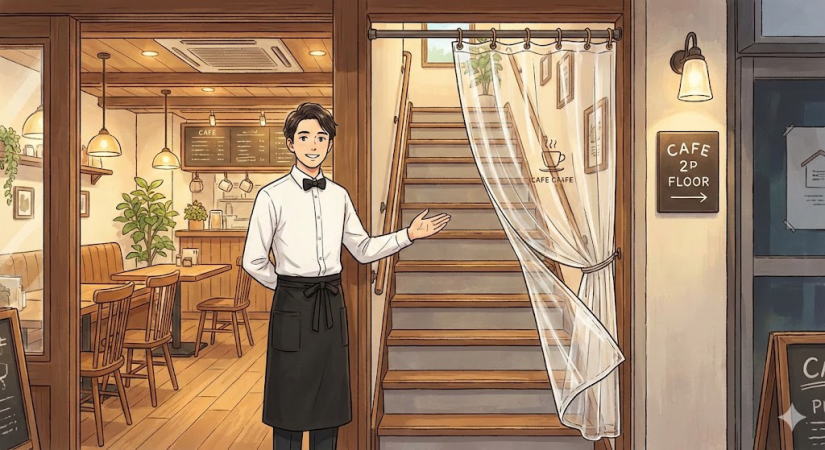 そしてもう一つ、こんな素敵な例もありました。 先日、おしゃれなカフェに行って2階席へ案内されたとき、階段の上がり口に「透明なビニールカーテン」が掛かっていたんです。