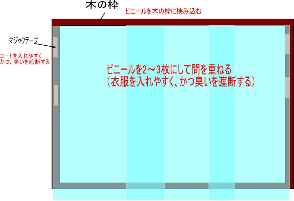 こんなイメージです。AIさんに作ってもらった画像なので上部が普通のカーテンレールになっていますが、これでは臭いが移ってしまいますね。